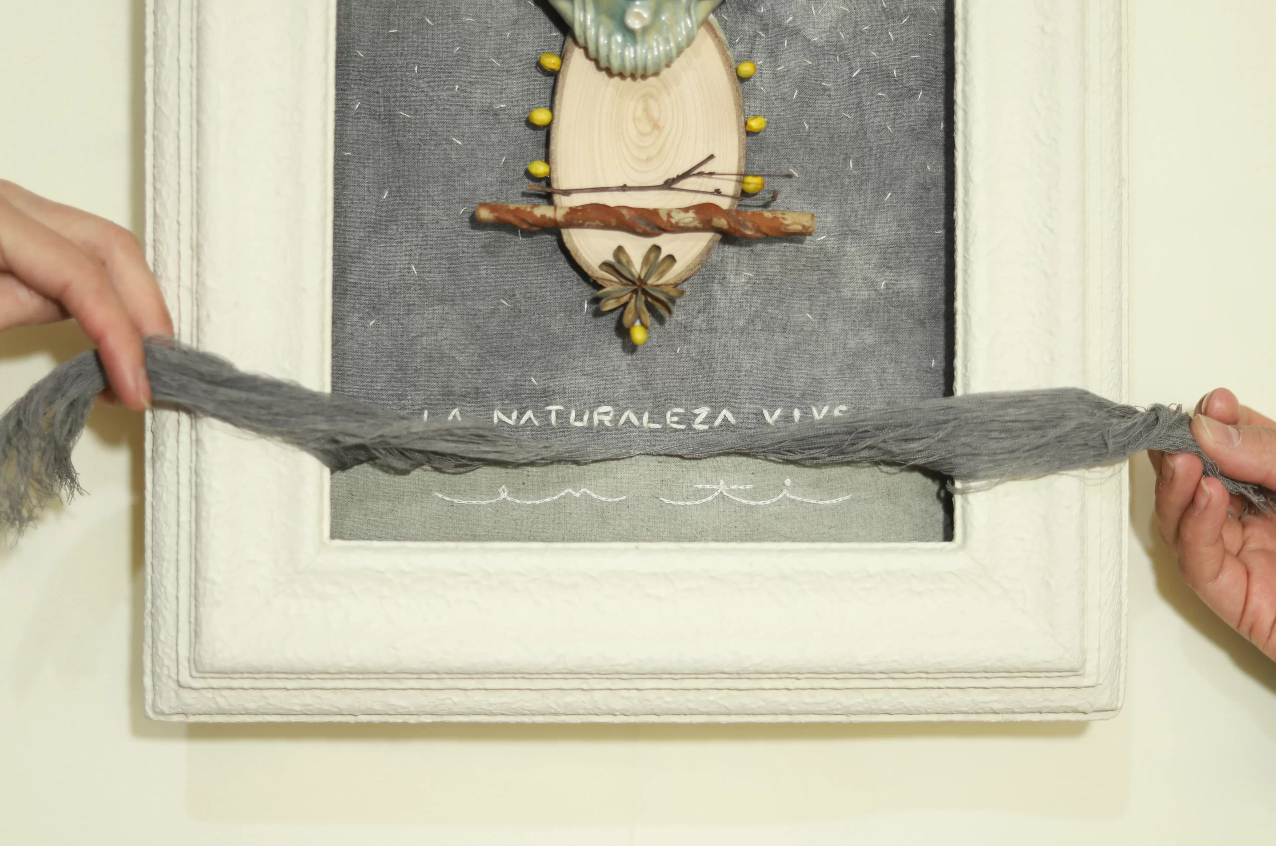 Ésta obra objeto es una de las más emblemáticas de la serie Origen a mano, al graficar explícitamente el concepto central que se quiere transmitir. Vemos un rostro (hecho de barro, cerámica esmaltada) que proviene literalmente de la tierra, rodeado de elementos naturales y con un mensaje claro por escrito, “la naturaleza vive”; cuelgan hilos que cubren un espacio del cuadro, ahí es donde la espectadora tiene que interactuar y mover los hilos para descubrir la segunda parte del mensaje, “en ti”. Con aquel gesto, metafóricamente se puede inferir que, hay que tomar acción para experimentar el autodescubrimiento.